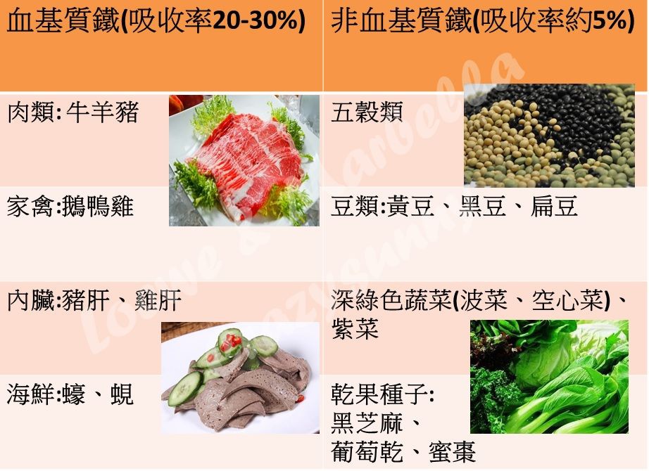 一是鐵質來源的選擇,二是搭配的食物會有增加或減少吸收的效果