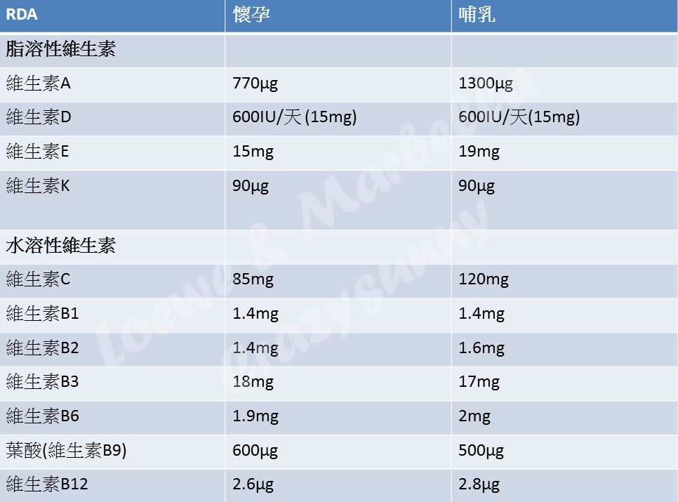 下兩圖呈現的是每種維生素礦物質的營養建議攝取量(RDA)
